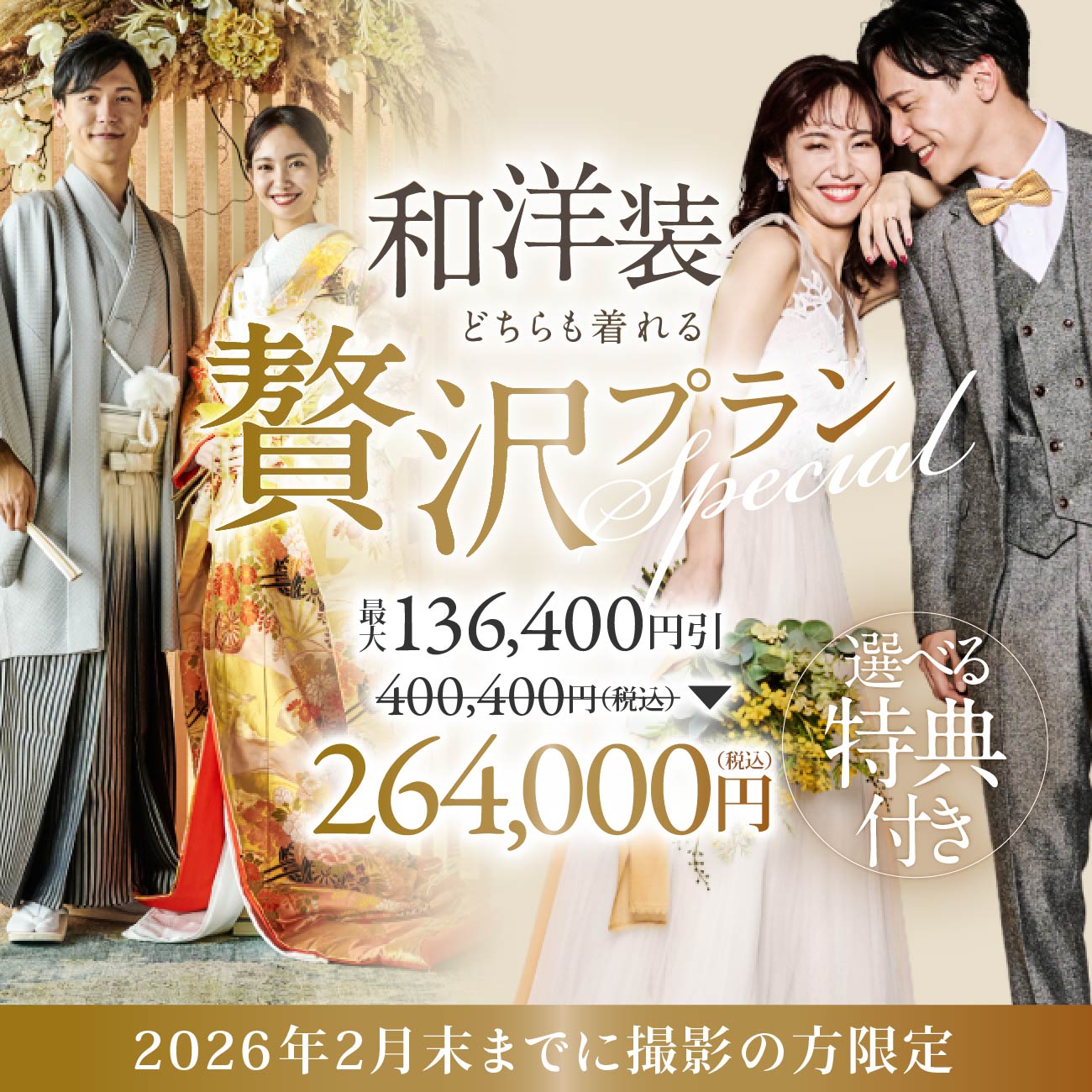 【贅沢フォト|2月末撮影まで】 <和装+洋装> 4大特典 + 今だけもう1つ特典プレゼント!