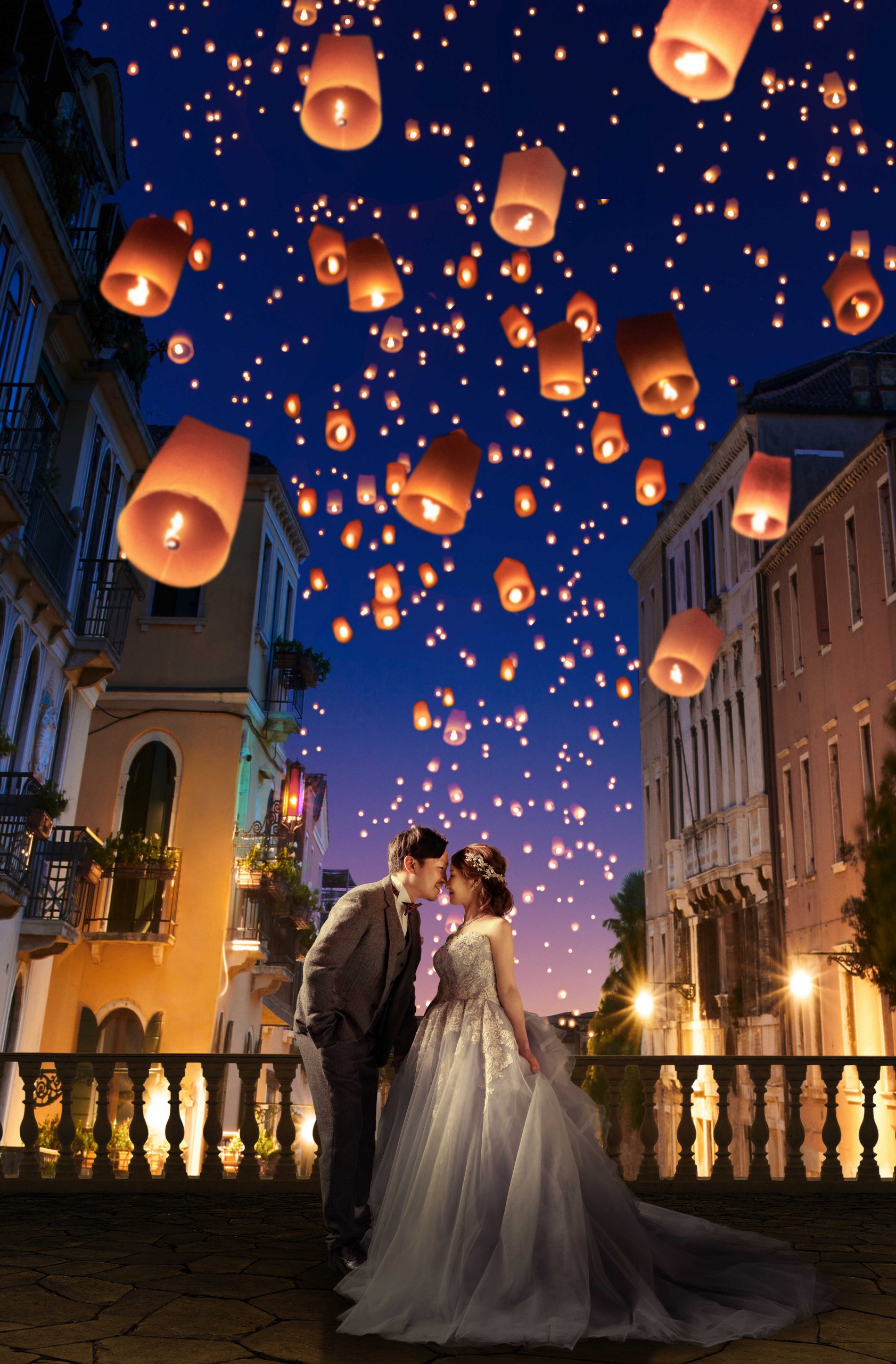 温かなランタンの光に包まれて、おでこを寄せ合うおふたり♡
