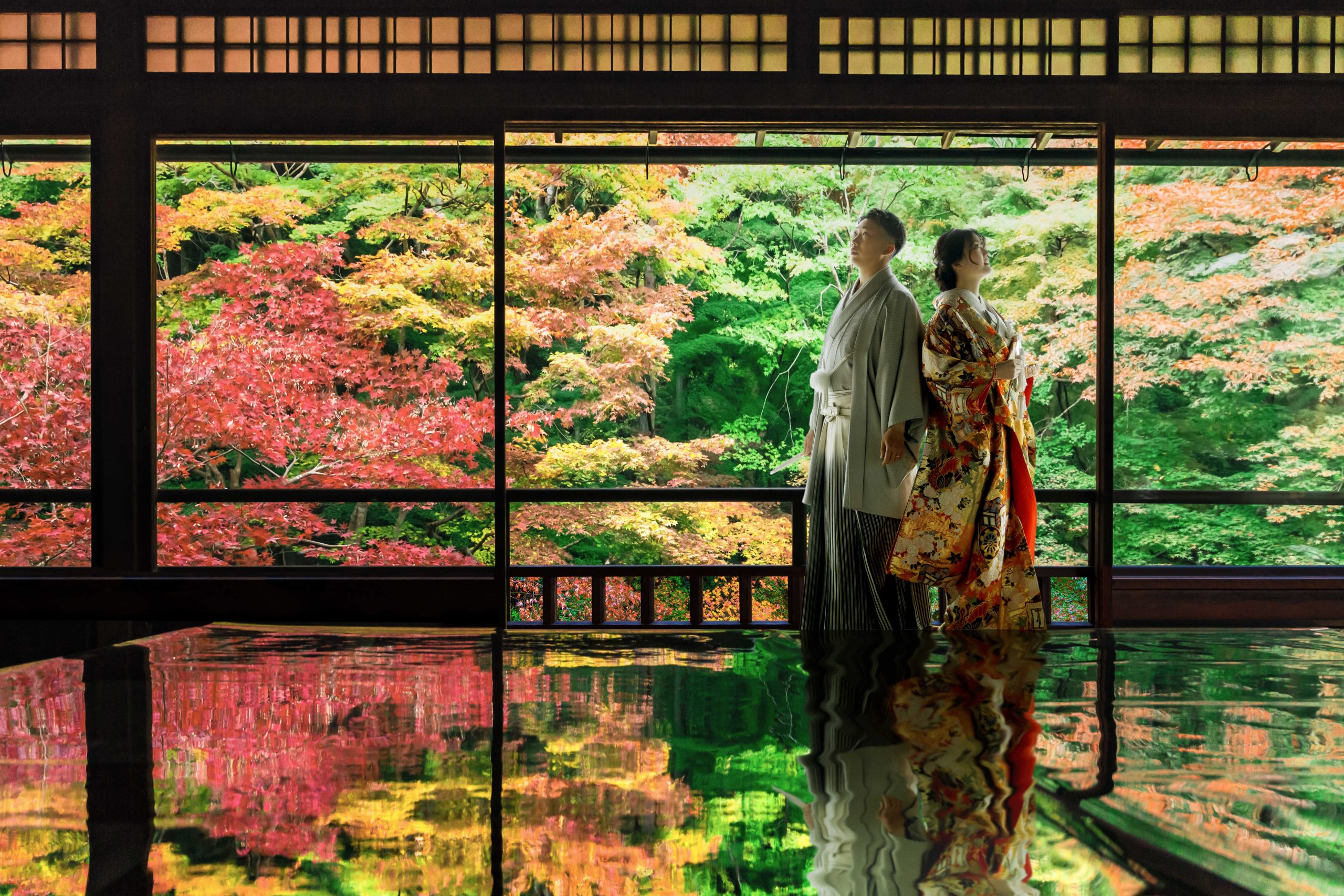 秋の紅葉を楽しむおふたり。床一面に反射する絶景が、まるで絵画のような世界観★