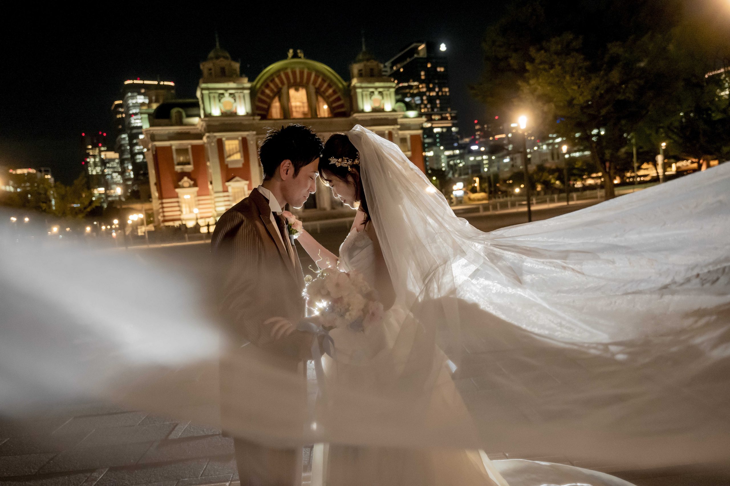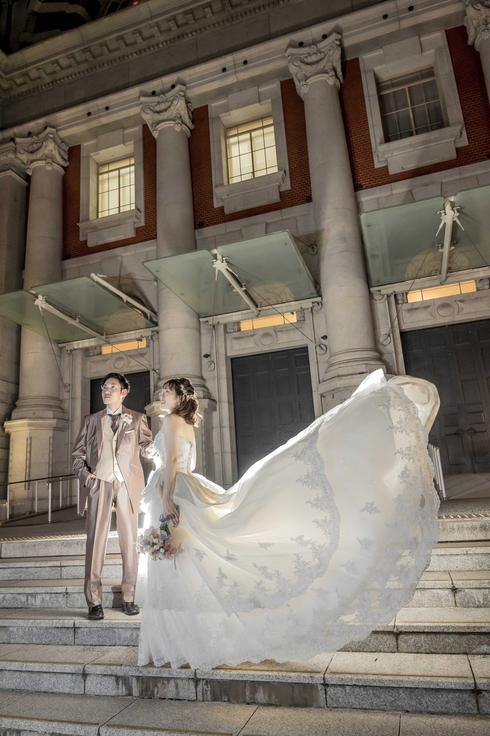 歴史的な中央公会堂の前で、新婦様のドレスが風になびく瞬間✧