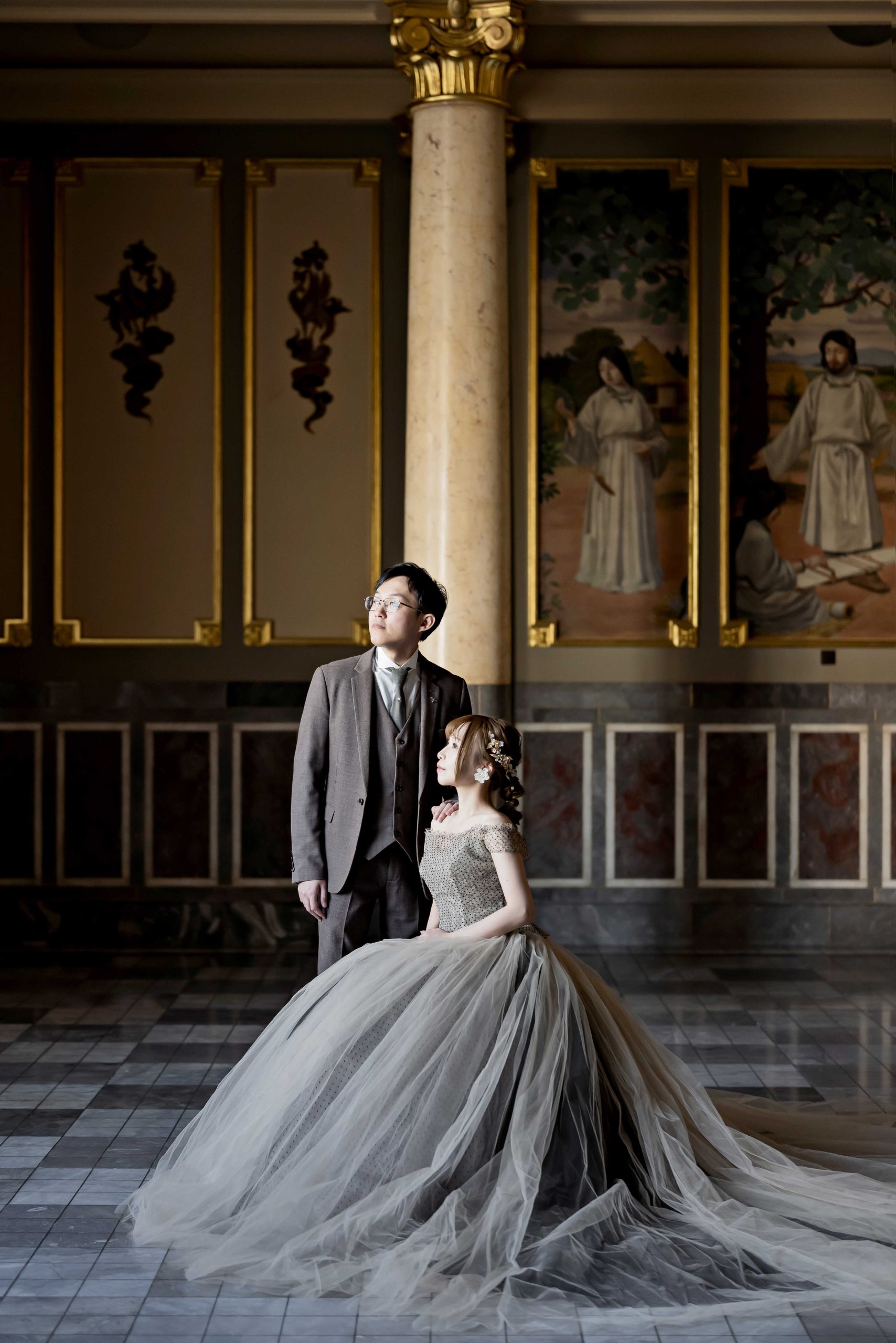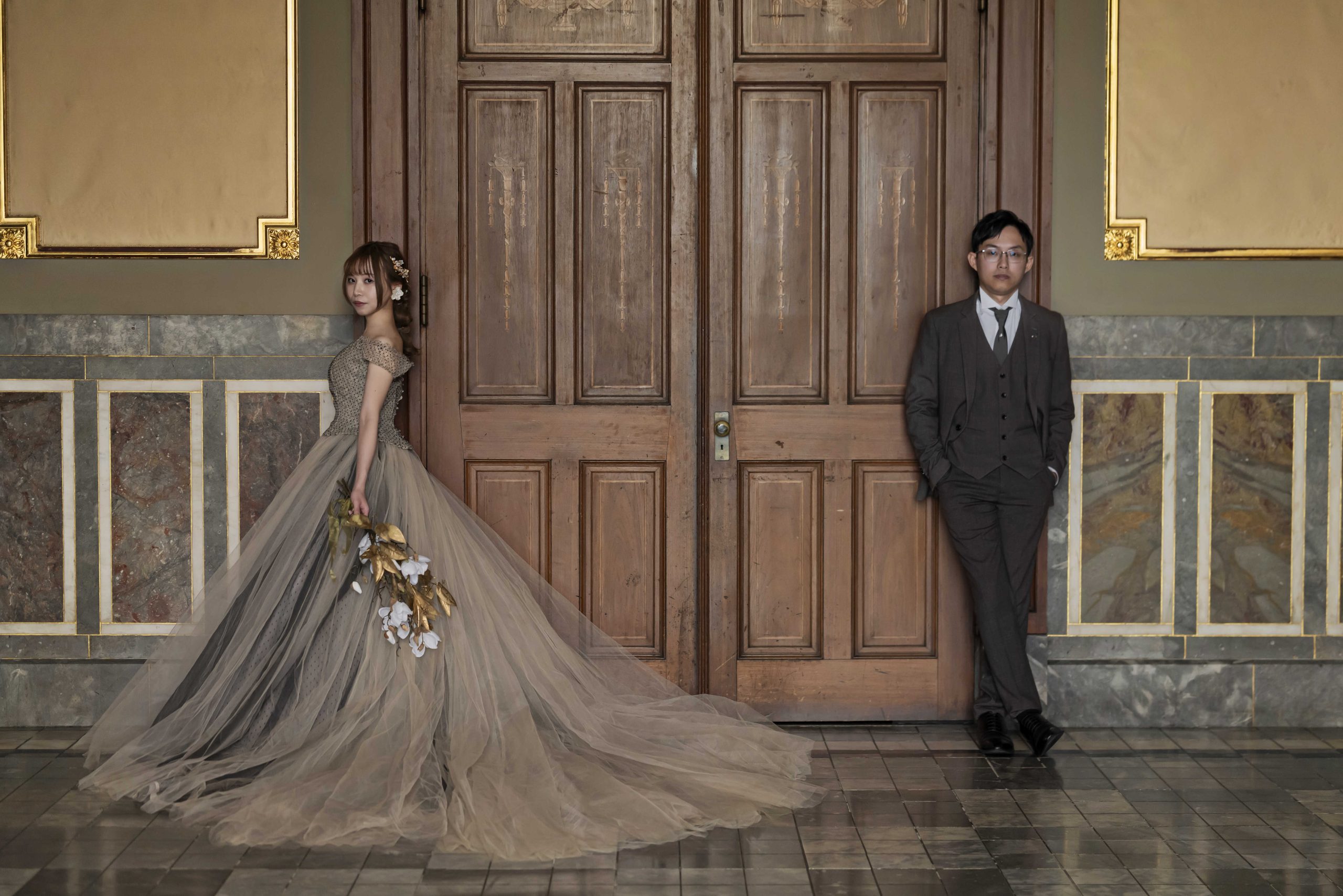 大きな建物の前で撮影することで、壮大なスケール感とおふたりの存在感が引き立つ印象的なショットに。