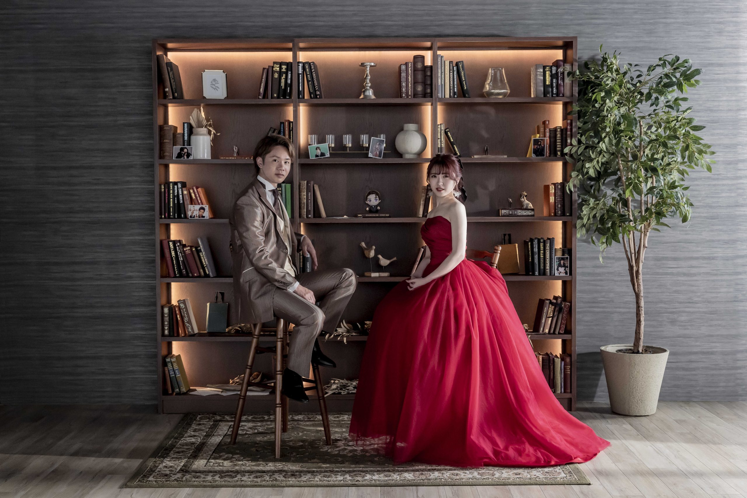 重厚感のある本棚を背景に、椅子に座るふたり。