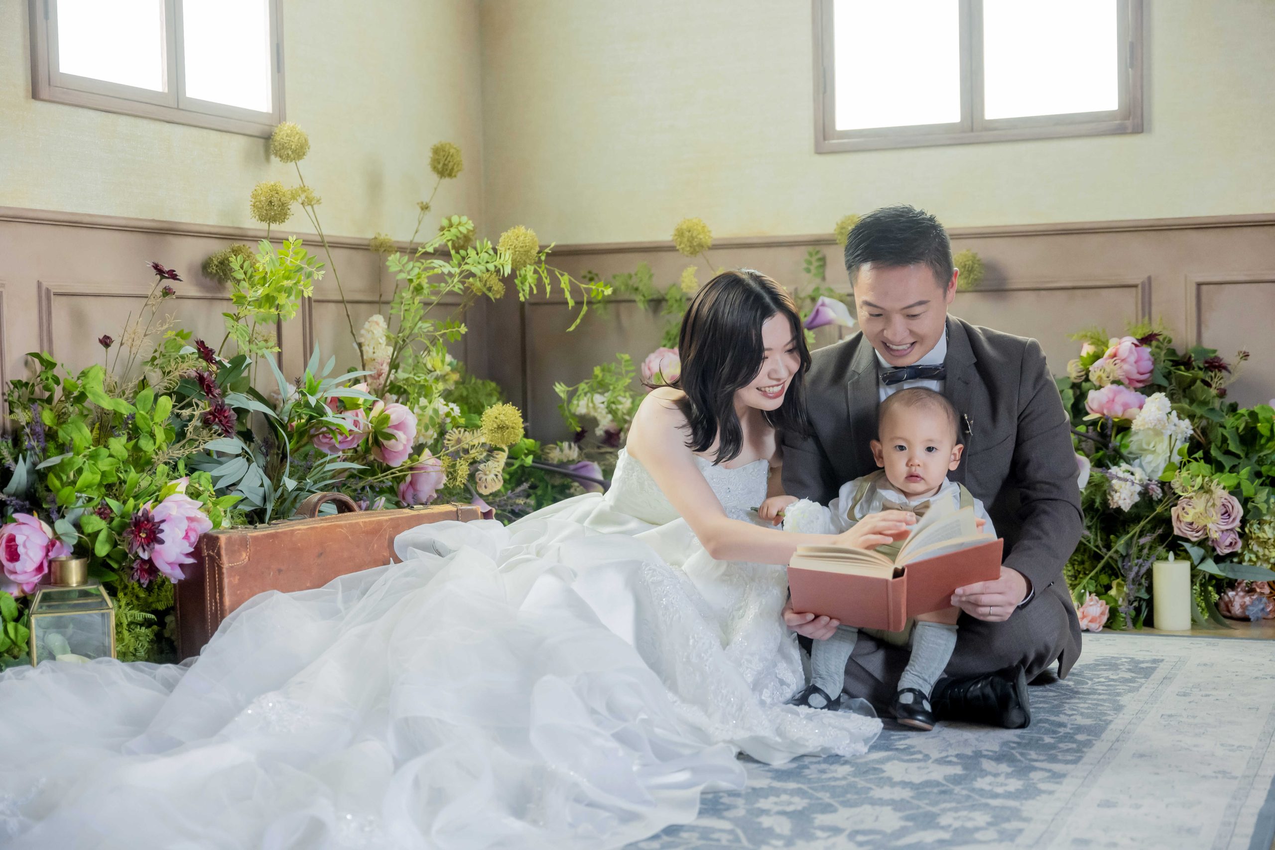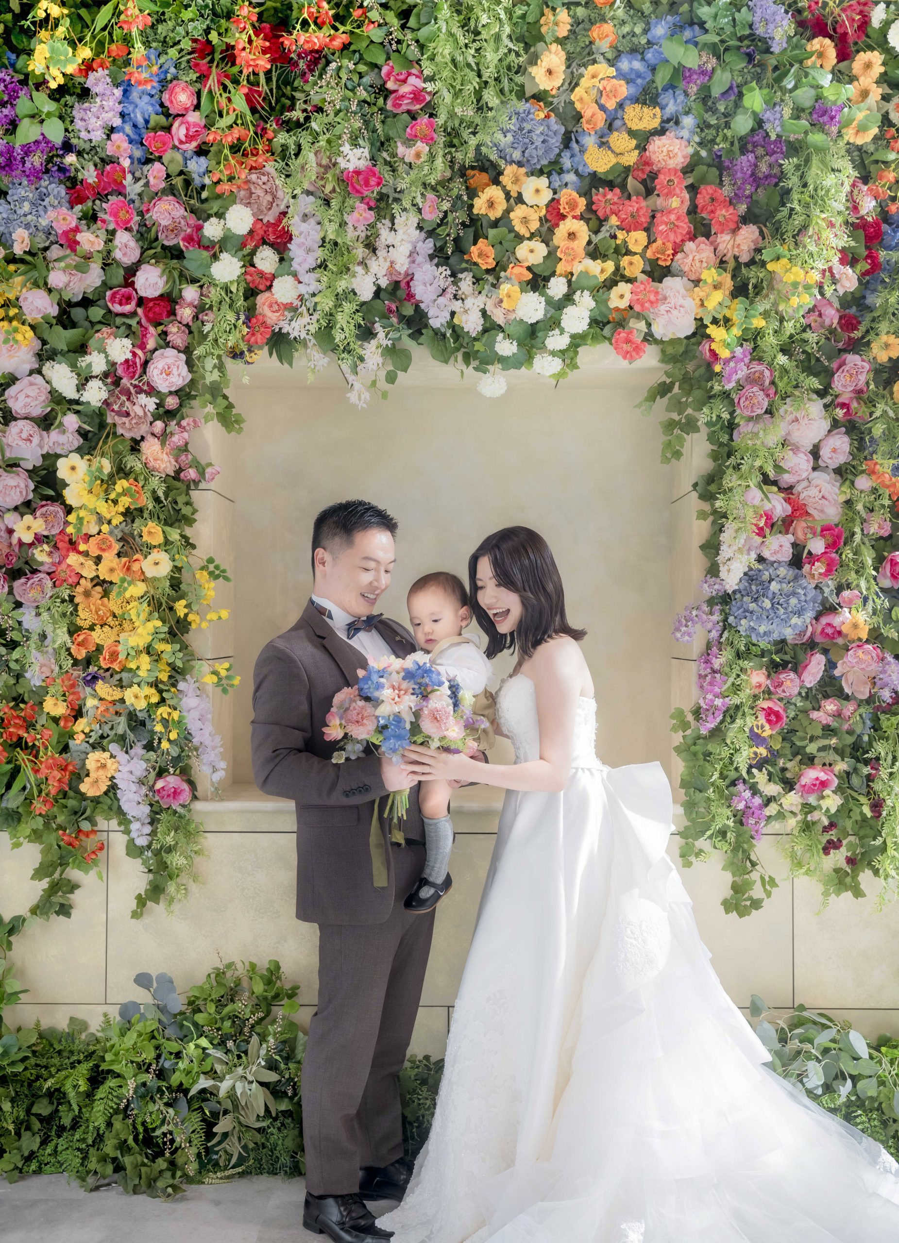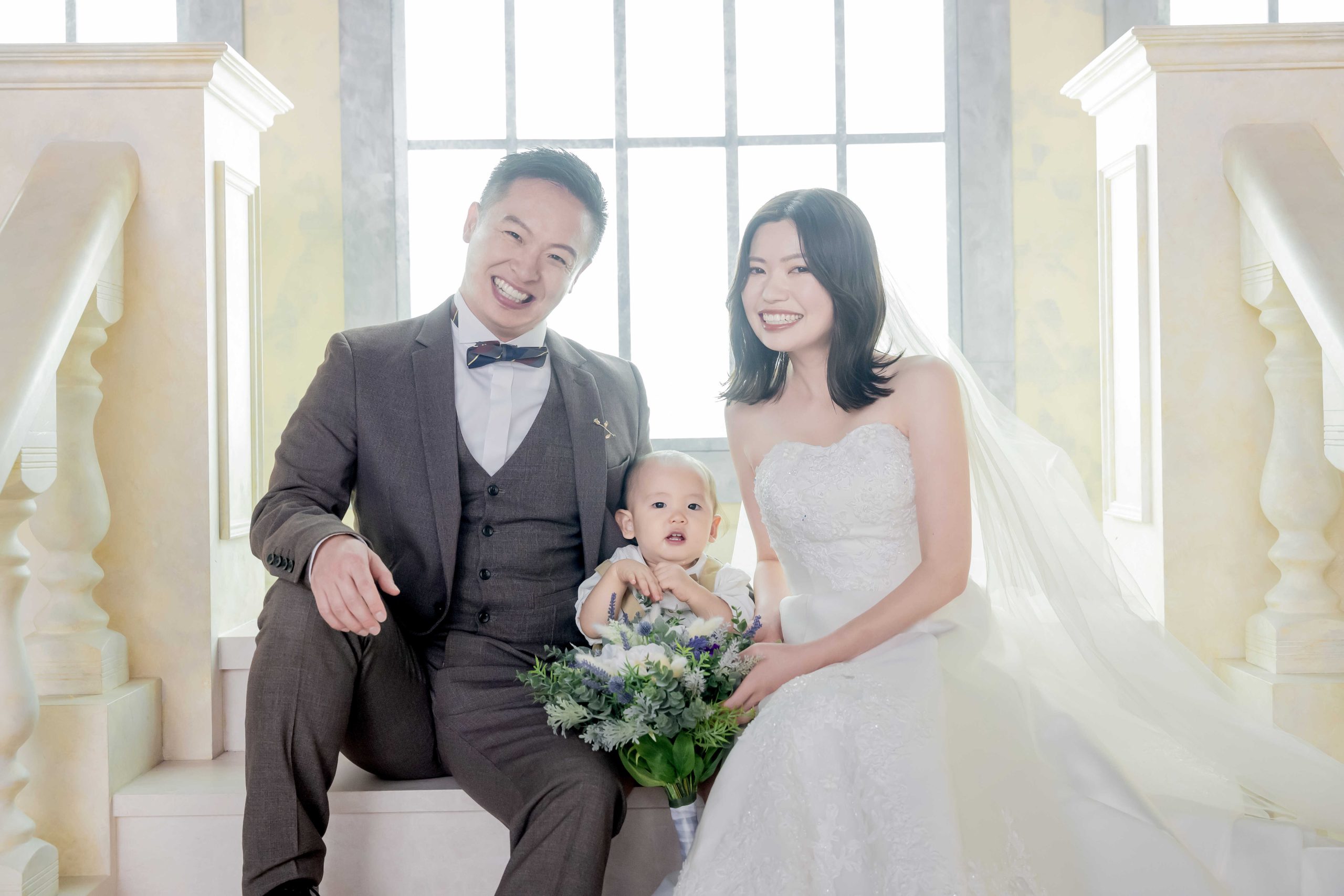 新郎様に抱きかかえられたお子様と、そっと寄り添う新婦様。