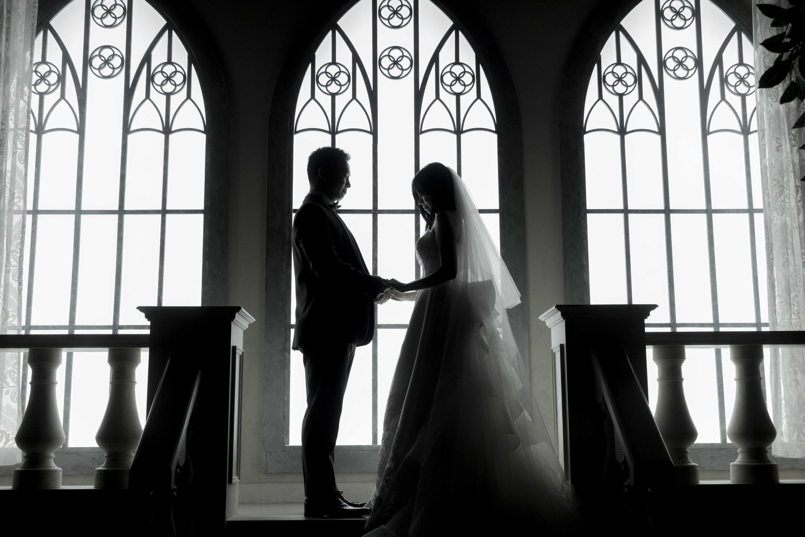 チャペルの光に包まれた、幻想的なシルエットショット。