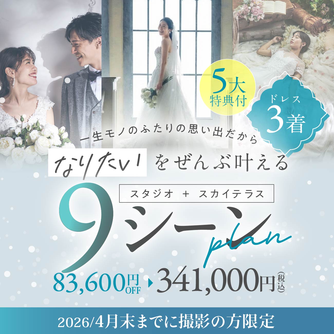 【春満喫!スタジオ+スカイテラス| 9シーンプラン(ドレス3着)!|4月末撮影まで】5大特典プレゼント付き!