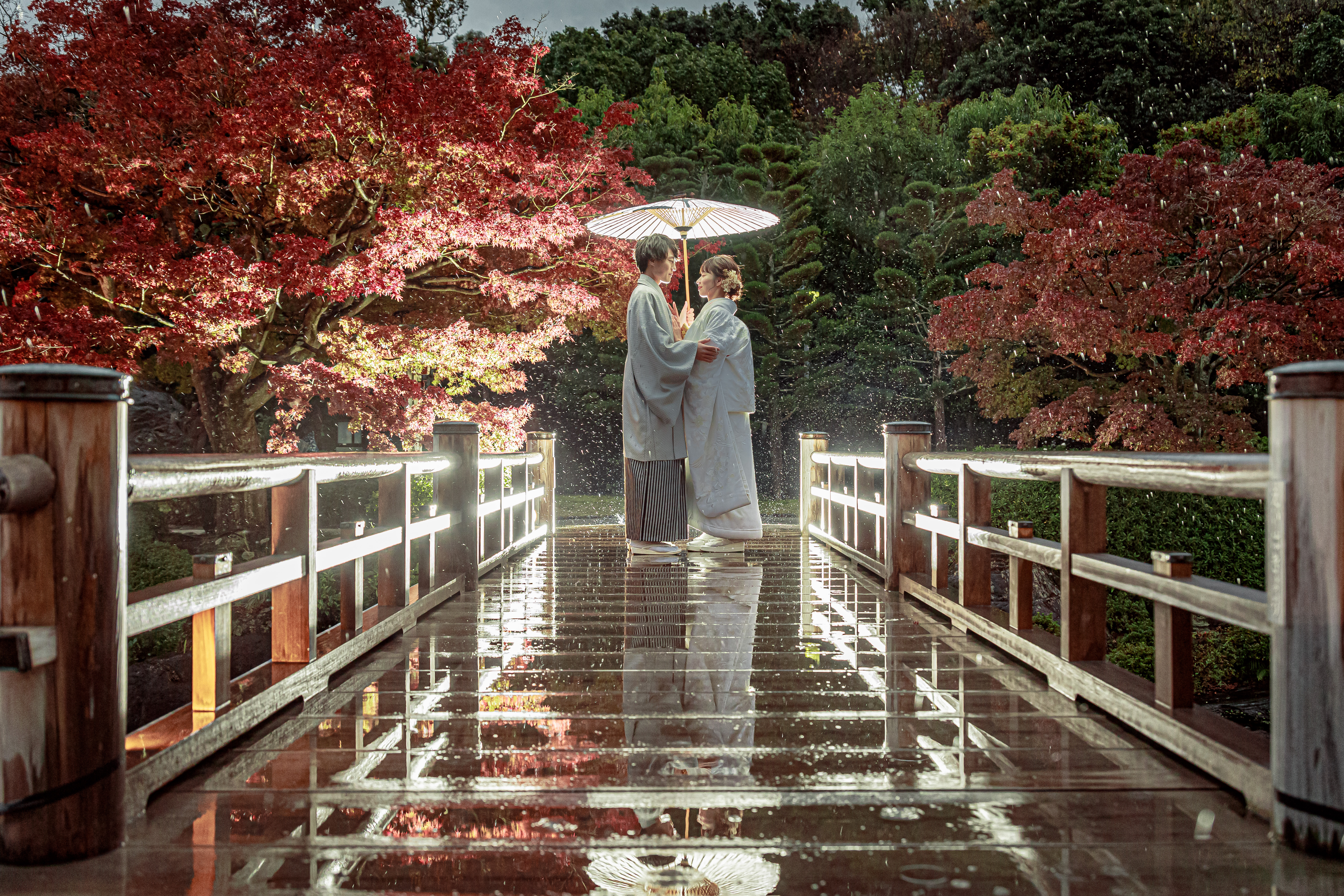 橋の上で和傘を差した姿は、風情とロマンチックさを兼ね備えた印象的な一枚になります。雨もふたりの姿を反射して、写真に奥行きと幻想的な雰囲気をプラスする味方に。