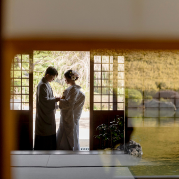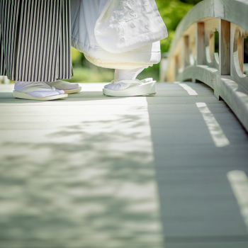 橋の上で和傘を差した姿は、風情とロマンチックさを兼ね備えた印象的な一枚になります。雨もふたりの姿を反射して、写真に奥行きと幻想的な雰囲気をプラスする味方に。