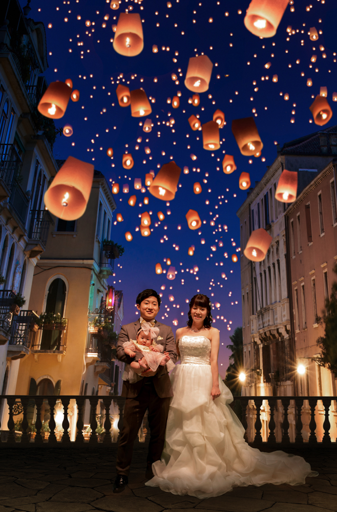 無数のランタンに包まれた新郎新婦様とお子様。