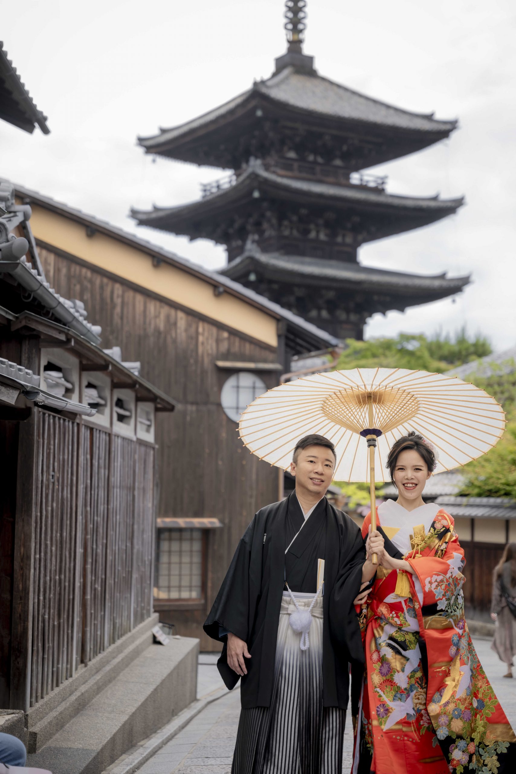 艶やかな和装姿に相合傘で寄り添うおふたり。