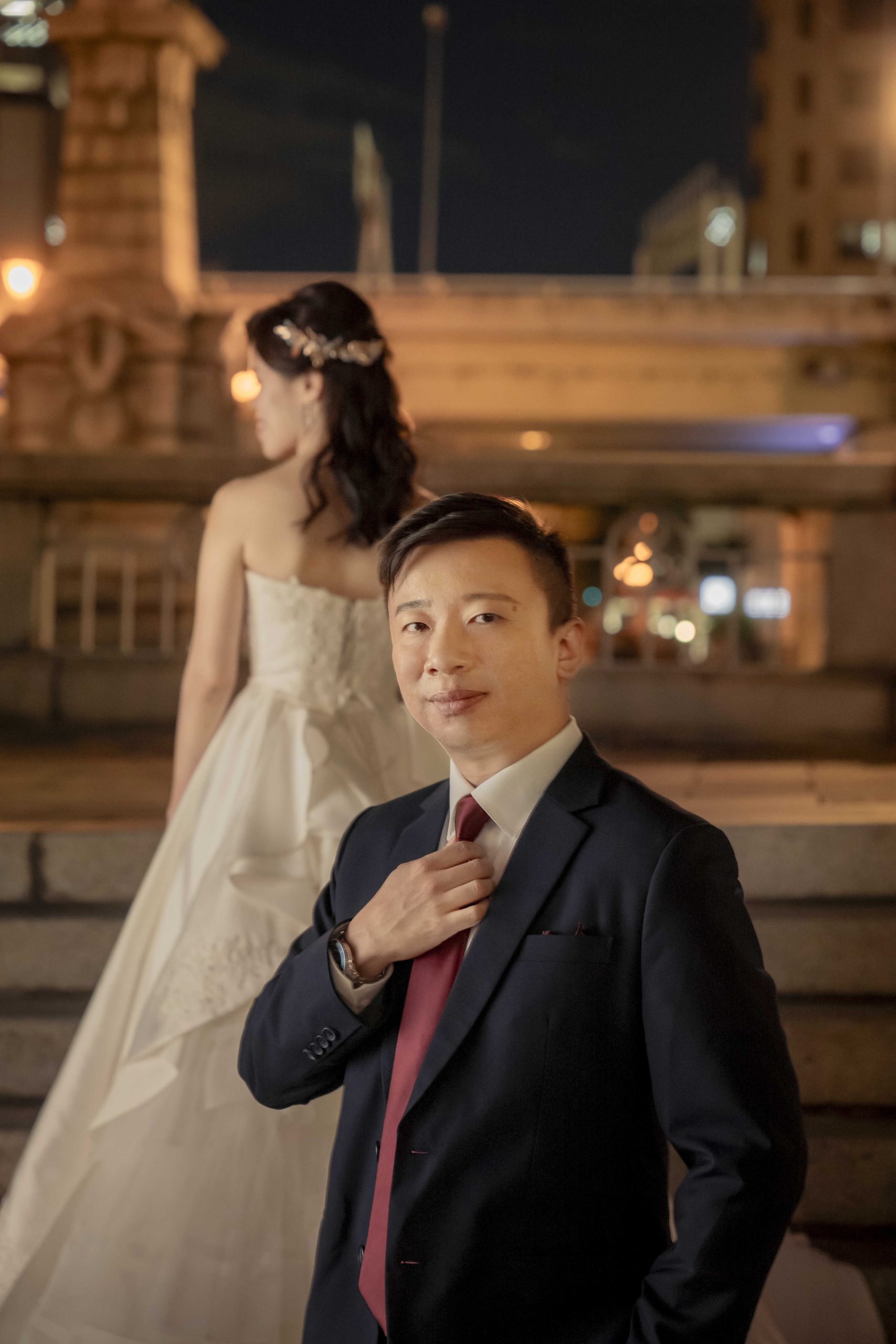 ライトアップされた中央公会堂をバックに、ベールが夜空に舞い上がる幻想的なショットです♪
