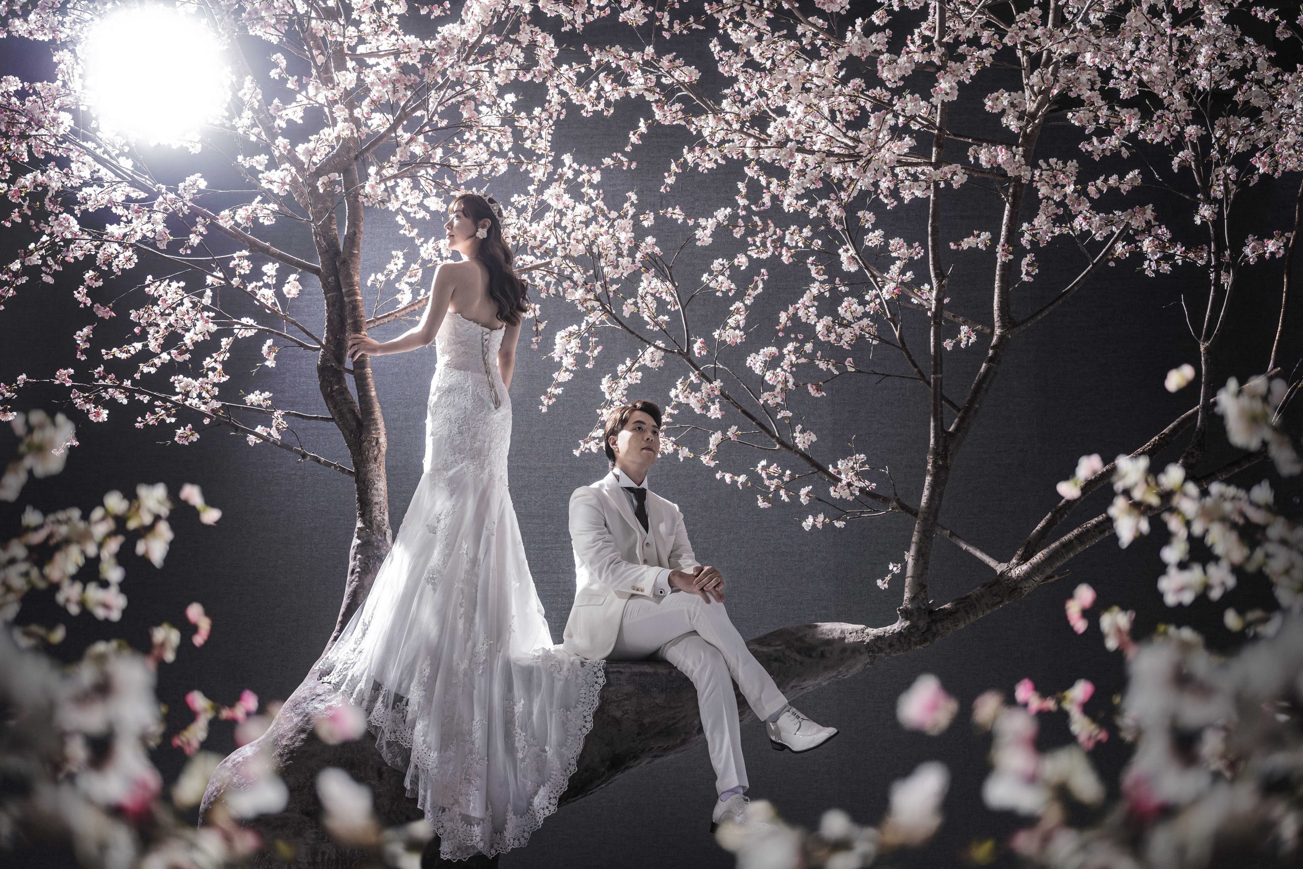 満開の桜に囲まれ、木の上から遠くを見つめる先にはおふたりの明るい未来が…♪