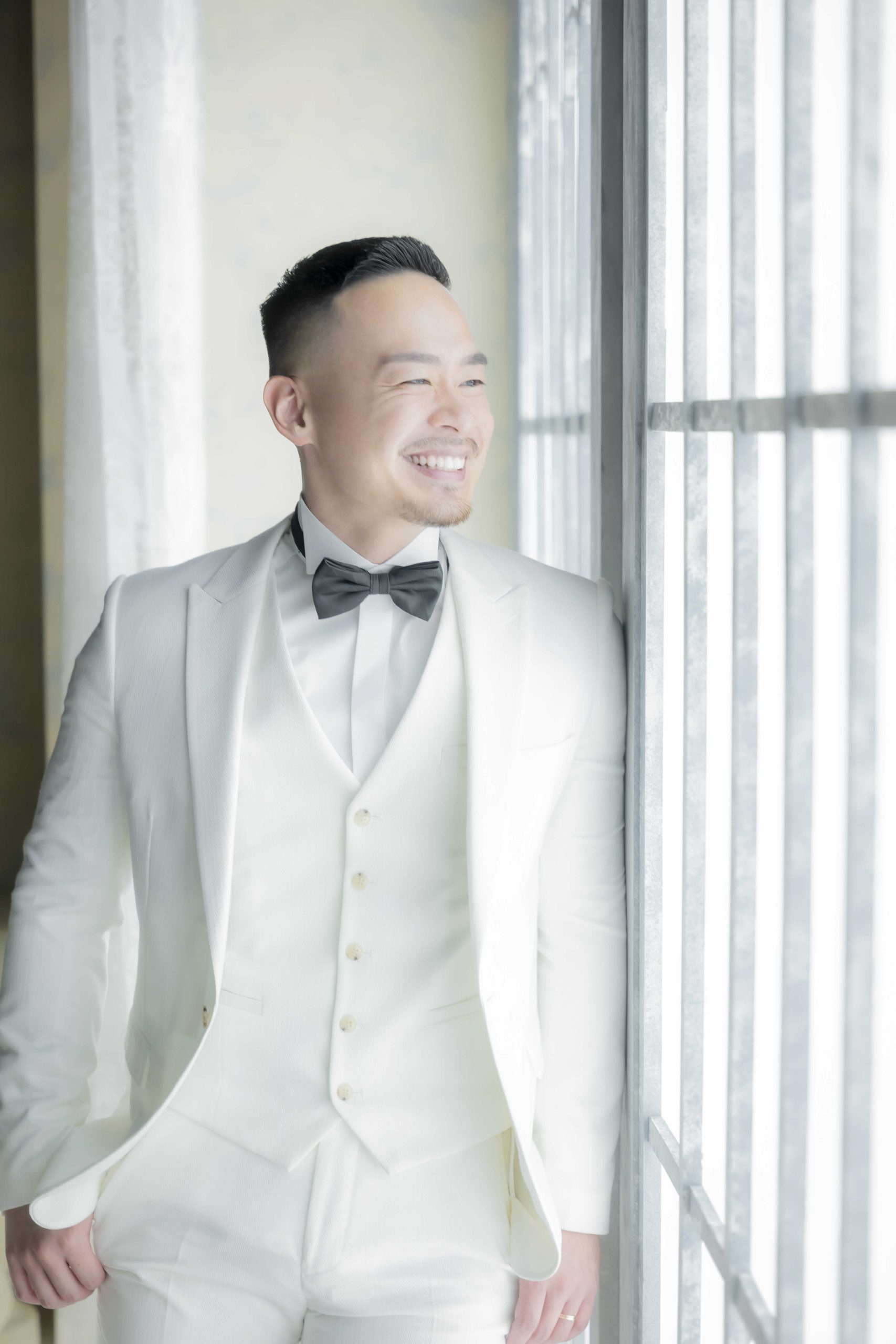 窓越しの柔らかな光の中で、遠くを見つめて微笑む新郎様。