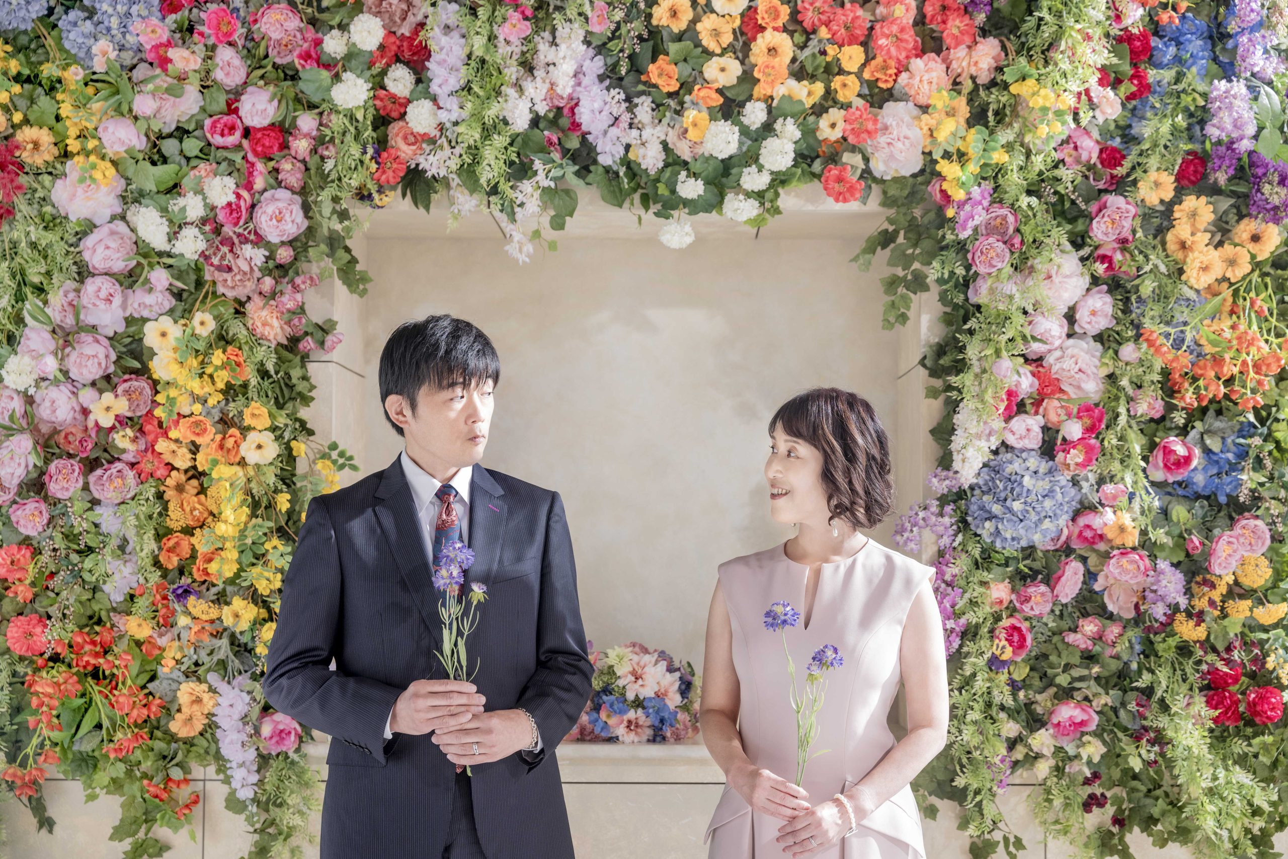 一輪の花を手に、そっと見つめ合うおふたり。