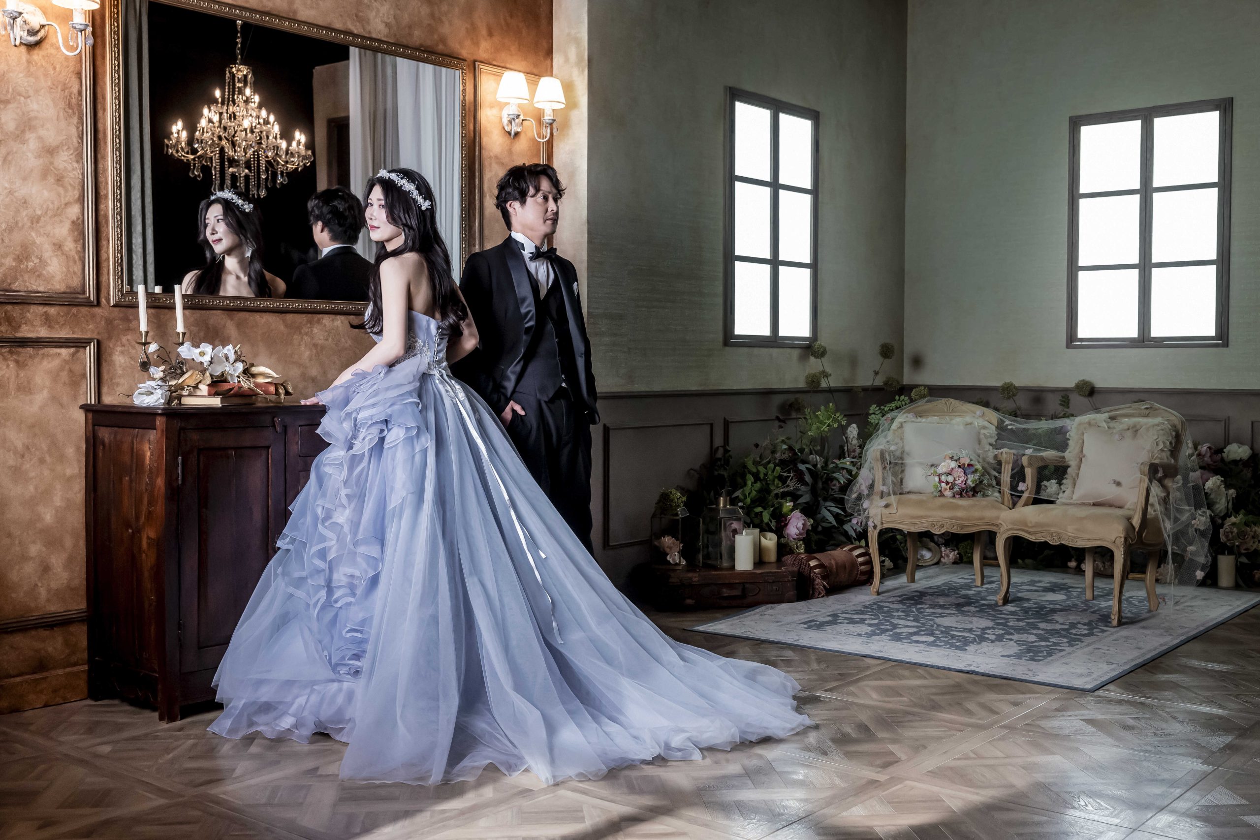 鏡の前で広がる美しいドレス