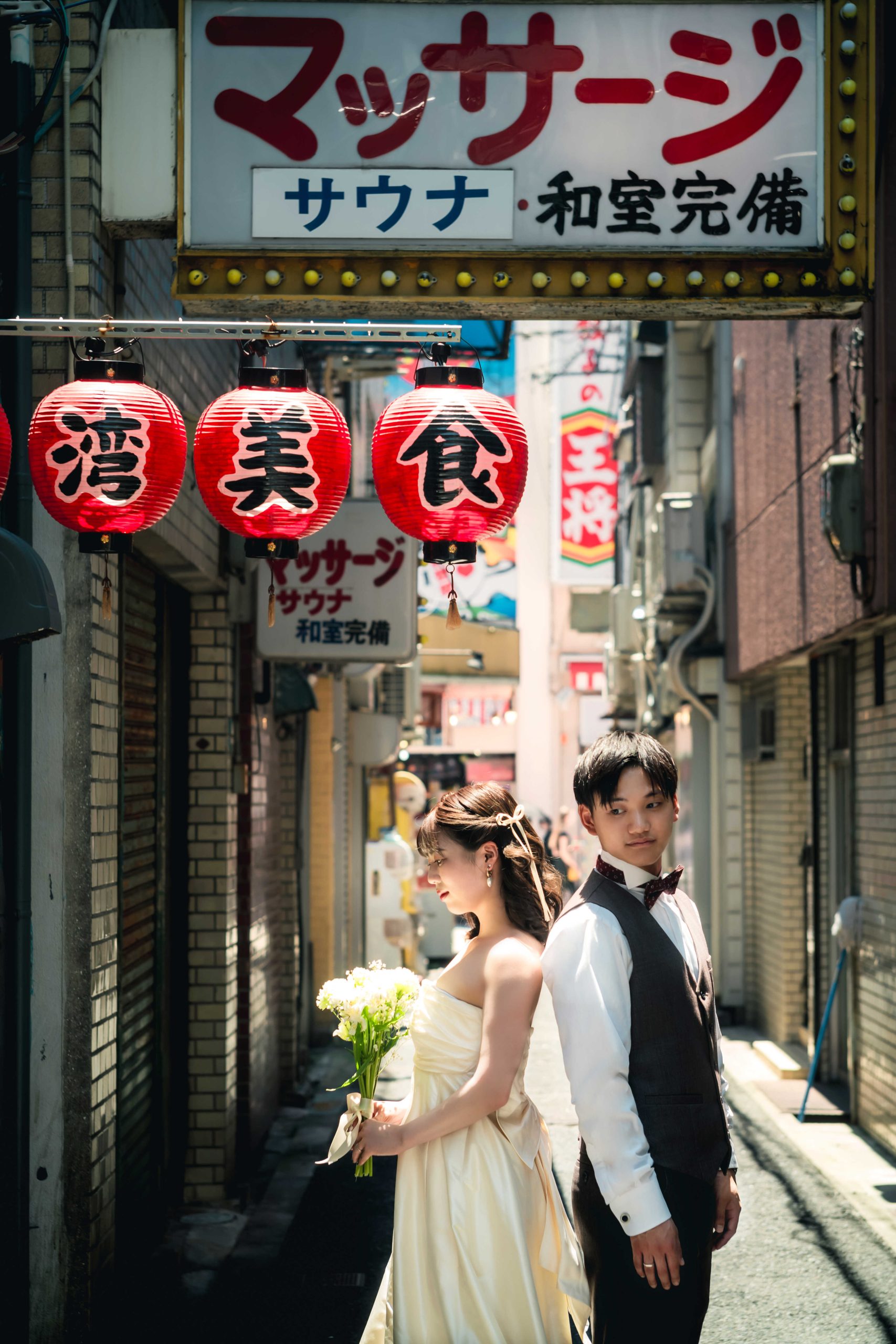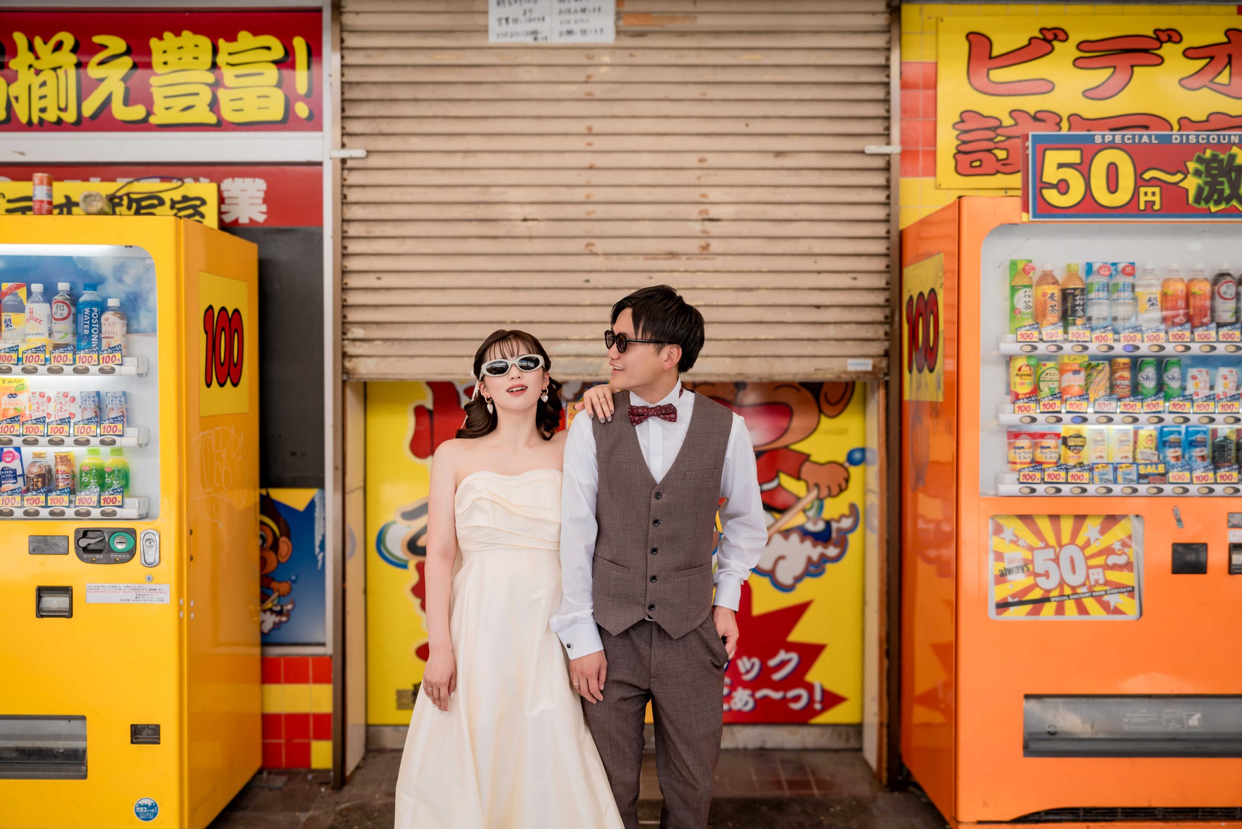 通天閣を背に、笑顔で寄り添うおふたりの幸せ時間